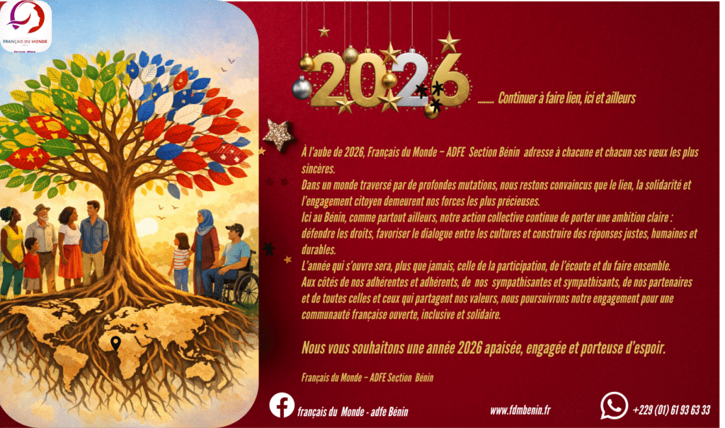 À l’aube de 2026, Français du Monde – ADFE Section Bénin adresse à chacune et chacun ses vœux les plus sincères. Dans un monde traversé par de profondes mutations, nous restons convaincus que le lien, la solidarité et l’engagement citoyen demeurent nos forces les plus précieuses. Ici au Bénin, comme partout ailleurs, notre action collective […]